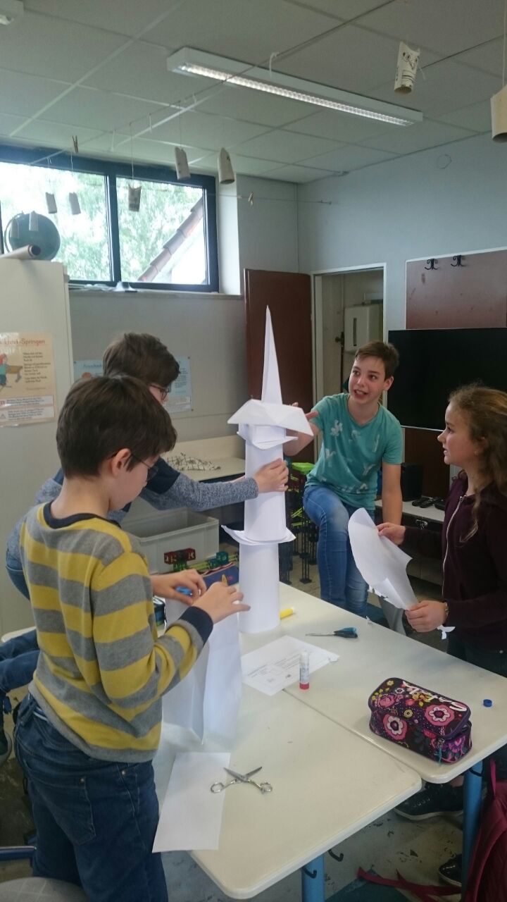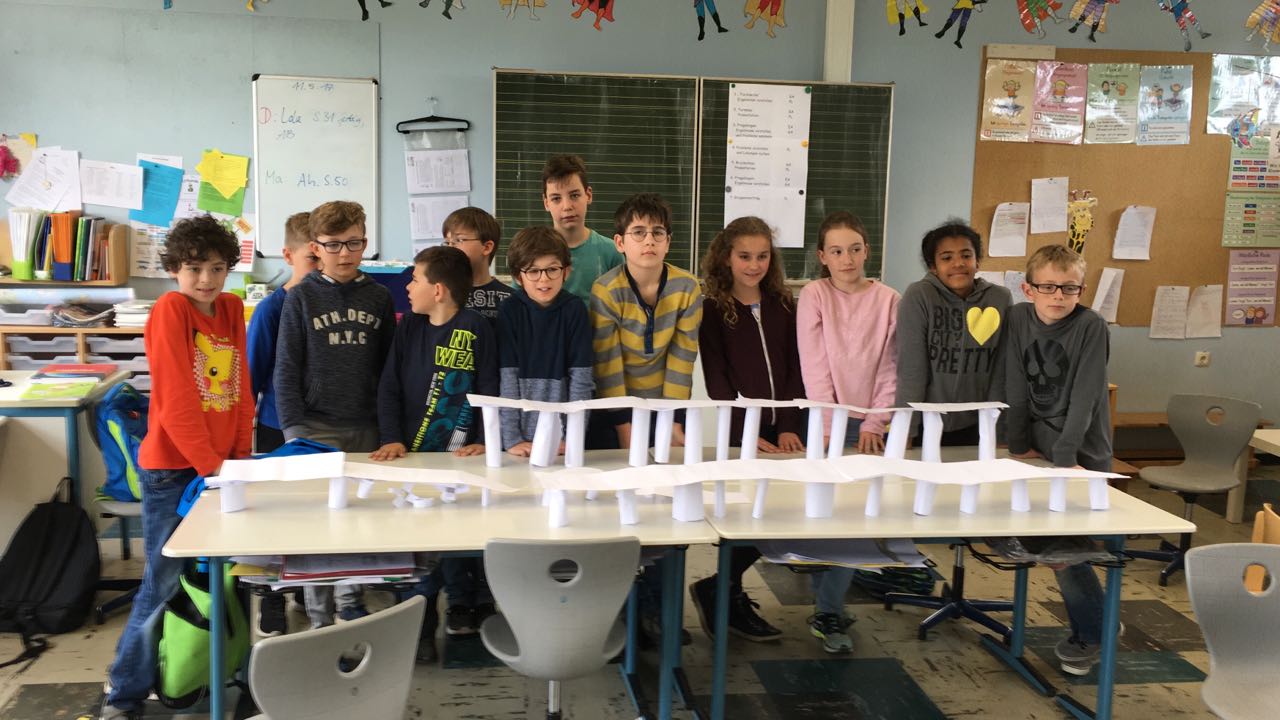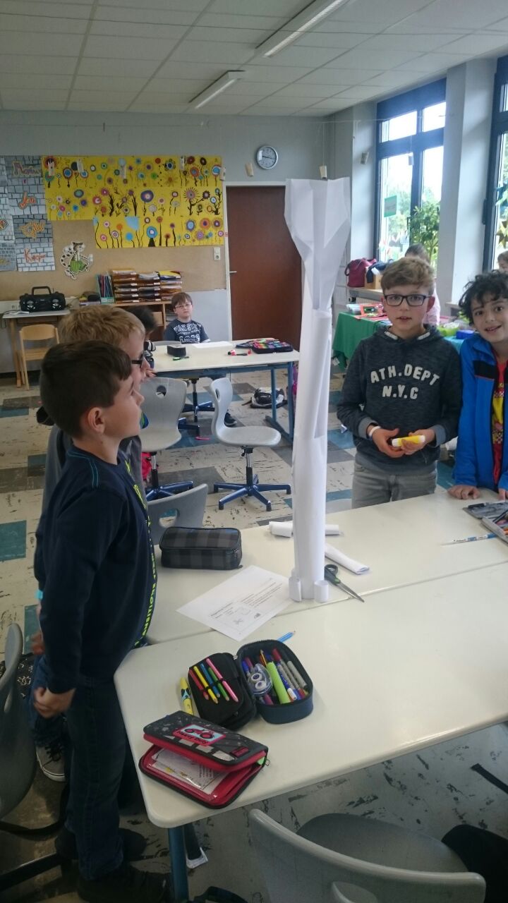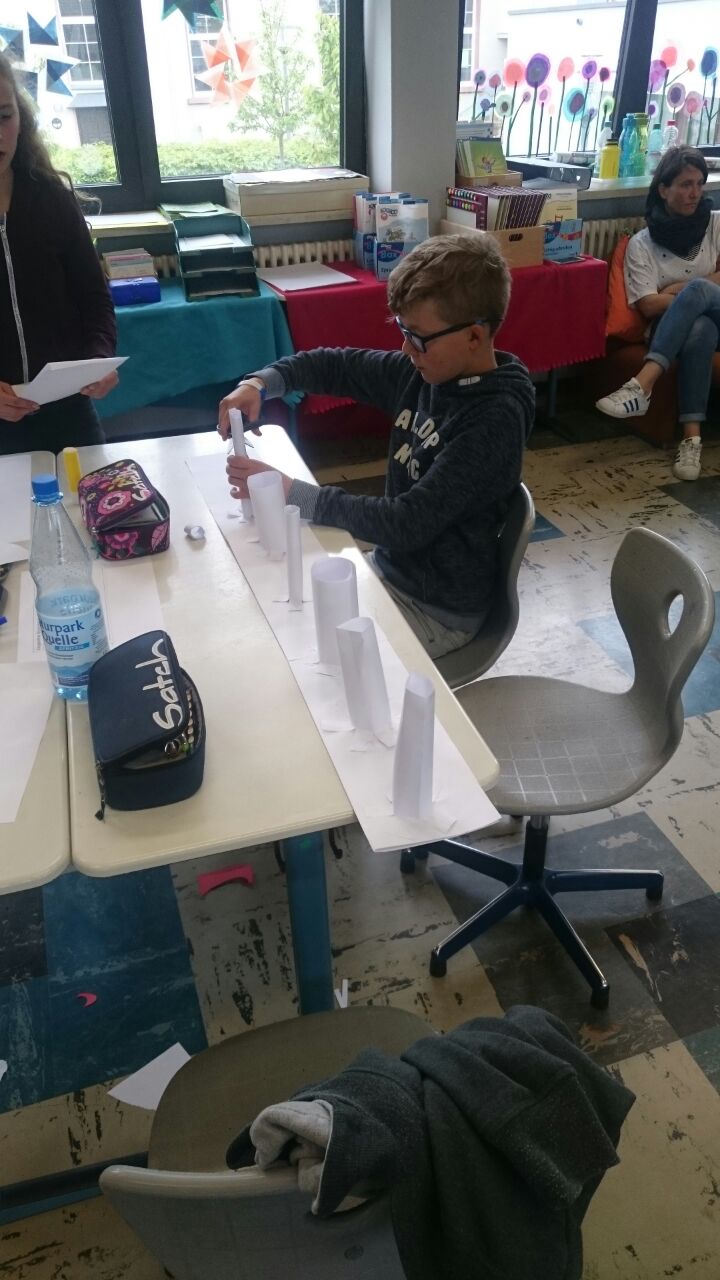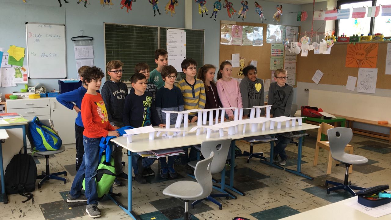 Nachdem die Kinder gemeinsam darüber nachgedacht hatten, wie sie sich ein gutes Team vorstellen, sollten sie in Zufallsgruppen einen Turm bauen. Zur Verfügung standen ihnen lediglich 10 Blatt Papier, eine Schere und ein Kleber. Die Ergebnisse wurden vorgestellt und reflektiert. Nun sollte in neuen Gruppen eine Brücke gebaut werden. Zum Schluss entwickelten die Gruppen einen gemeinsamen Vertrag für “eine gute Gruppenarbeit”!