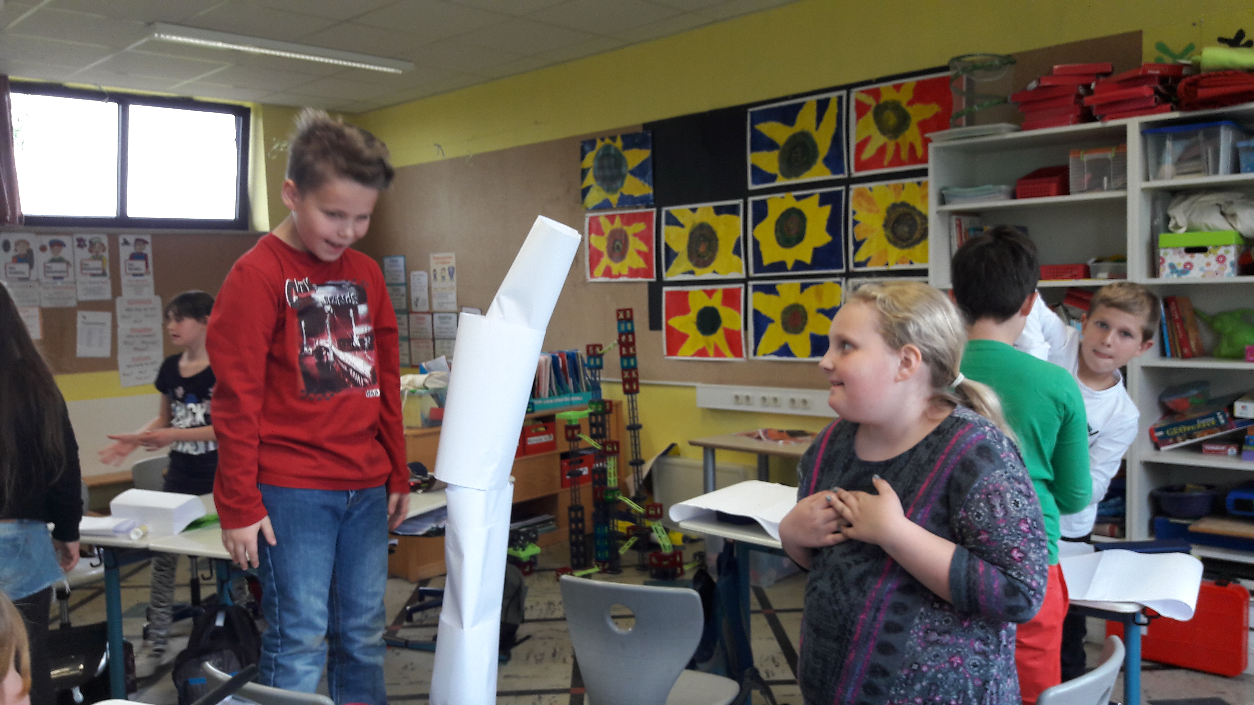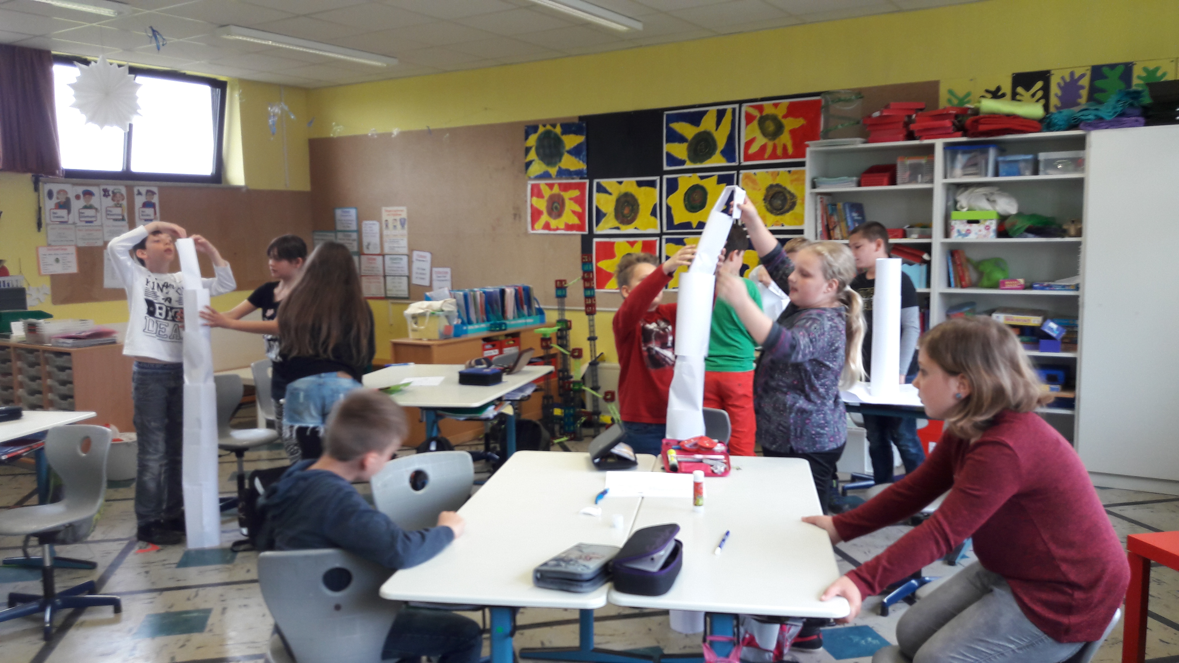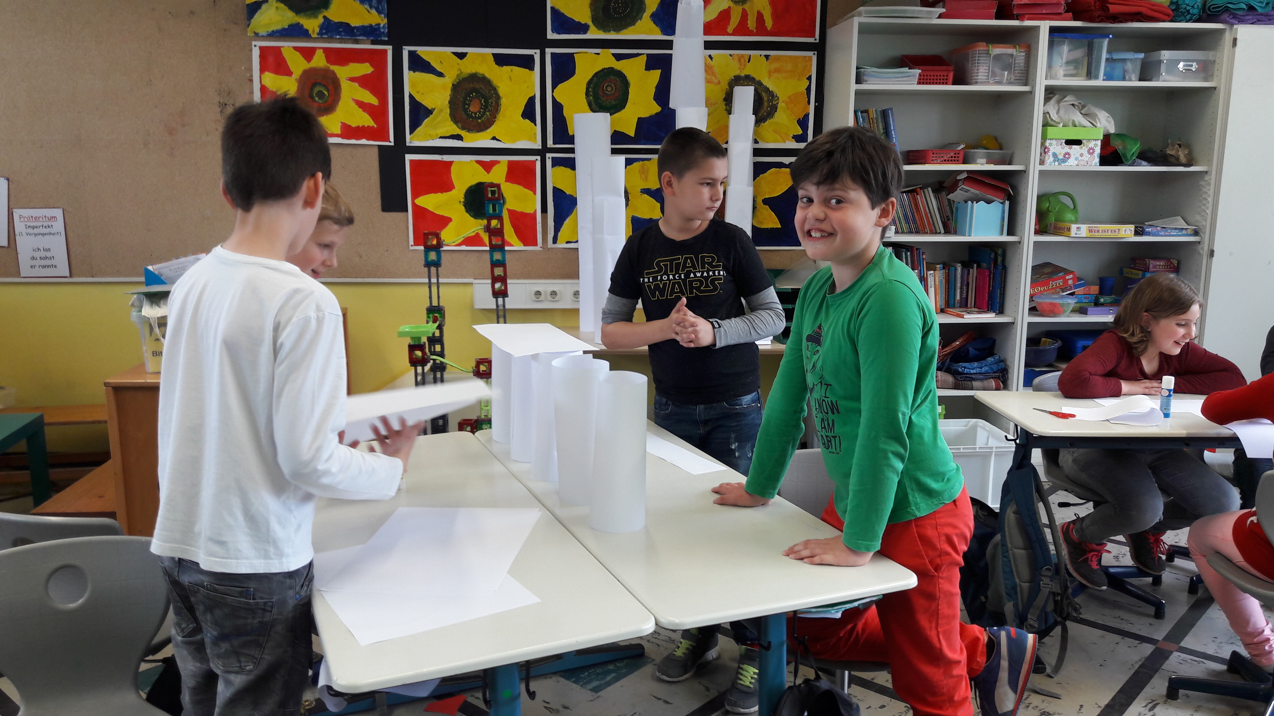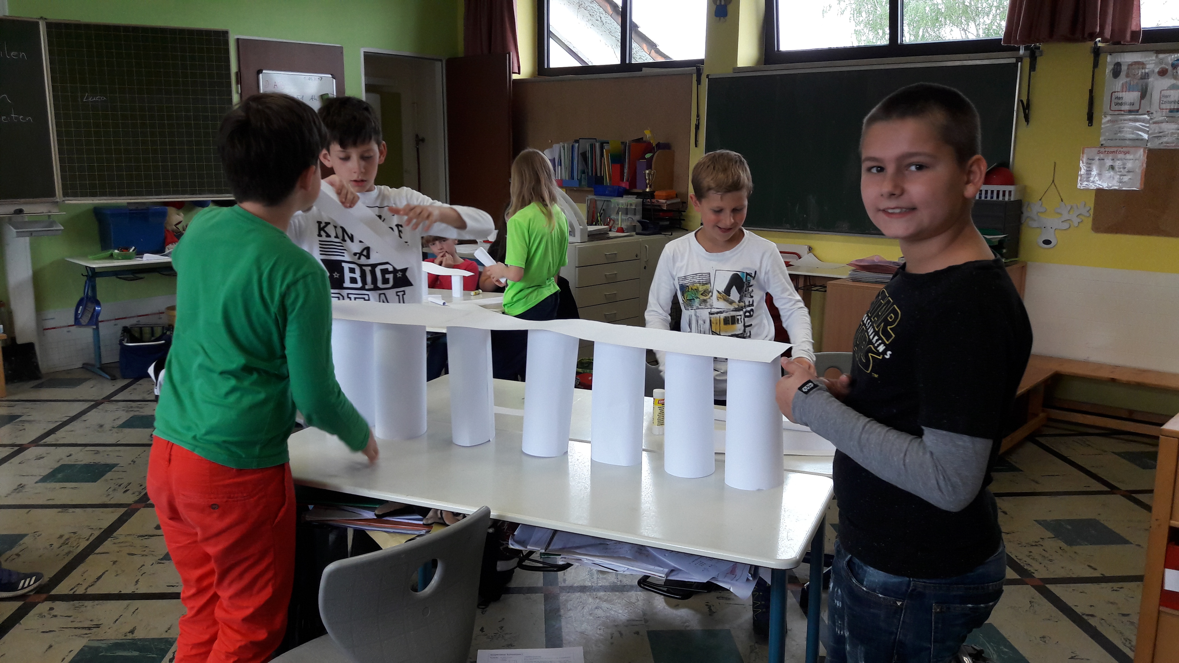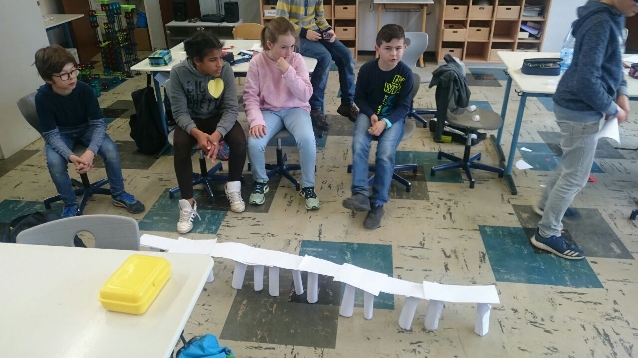 Nachdem die Kinder gemeinsam darüber nachgedacht hatten, wie sie sich ein gutes Team vorstellen, sollten sie in Zufallsgruppen einen Turm bauen. Zur Verfügung standen ihnen lediglich 10 Blatt Papier, eine Schere und ein Kleber. Die Ergebnisse wurden vorgestellt und reflektiert. Nun sollte in neuen Gruppen eine Brücke gebaut werden. Zum Schluss entwickelten die Gruppen einen gemeinsamen Vertrag für “eine gute Gruppenarbeit”!