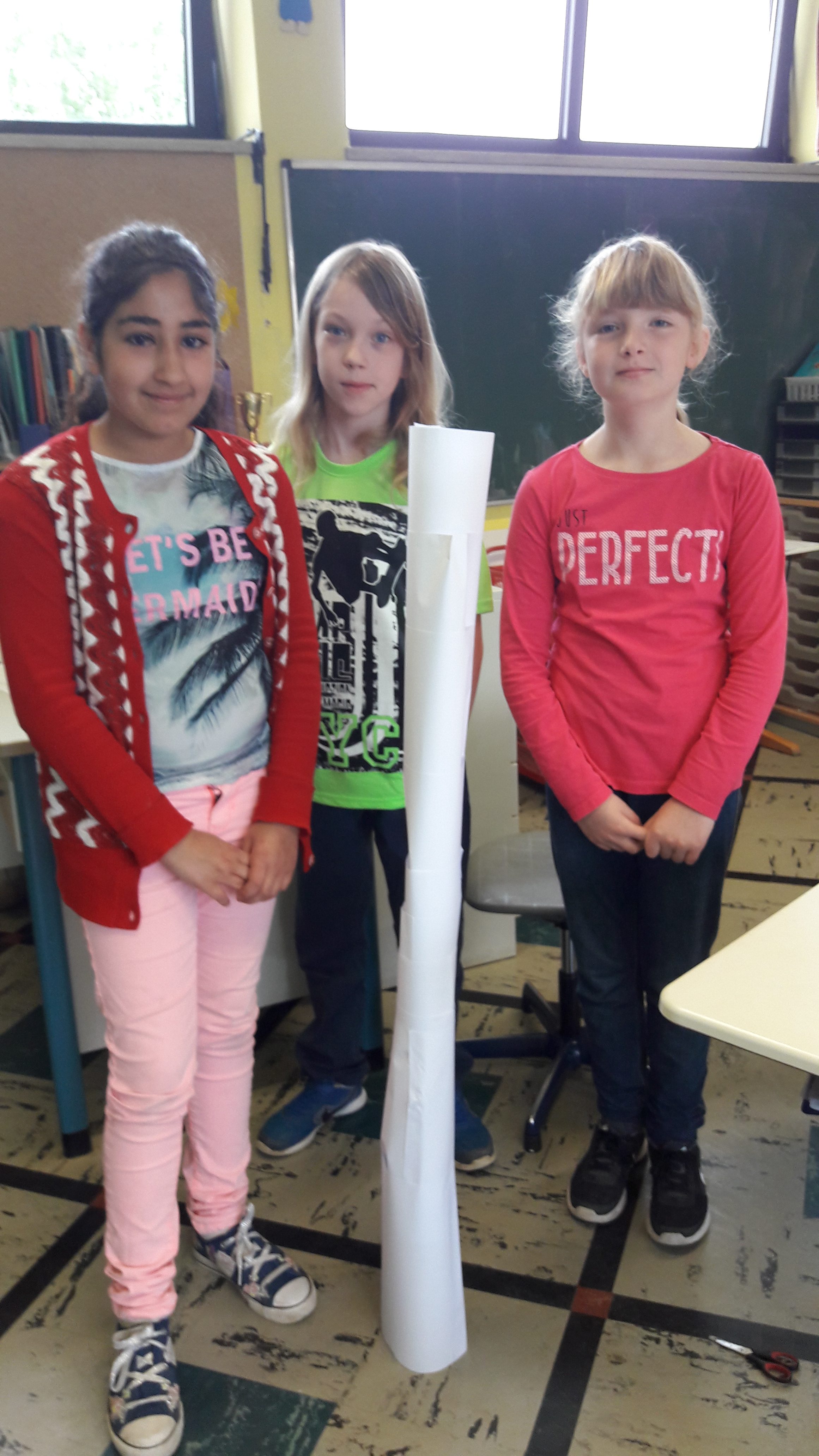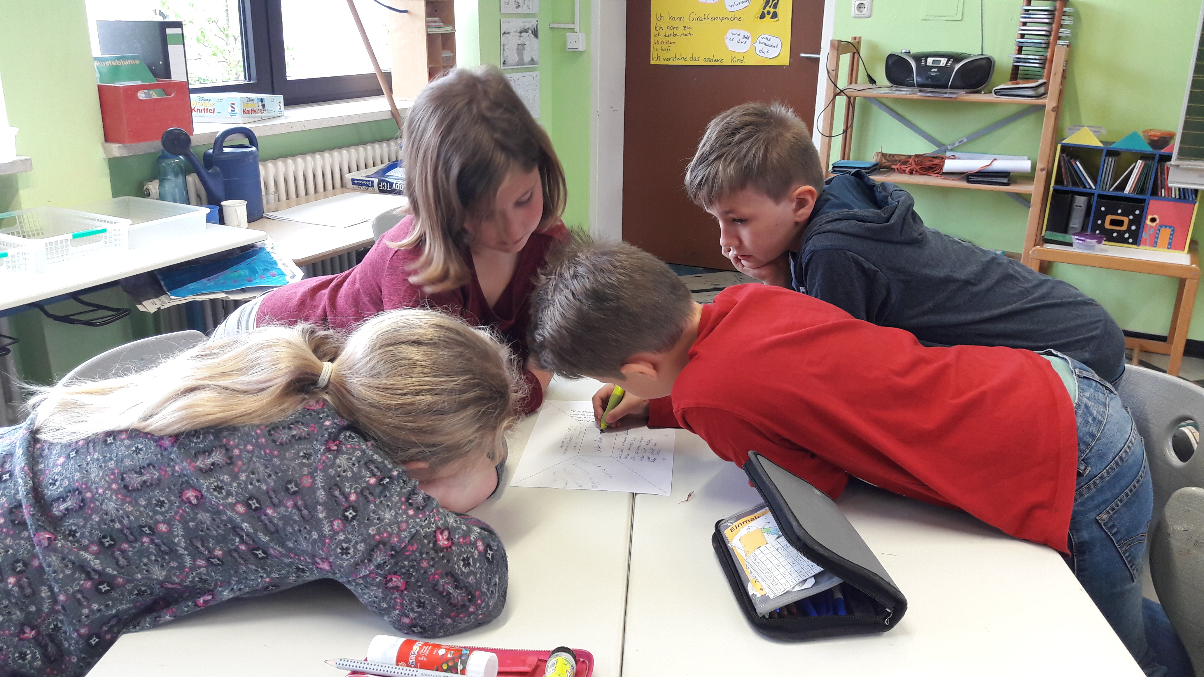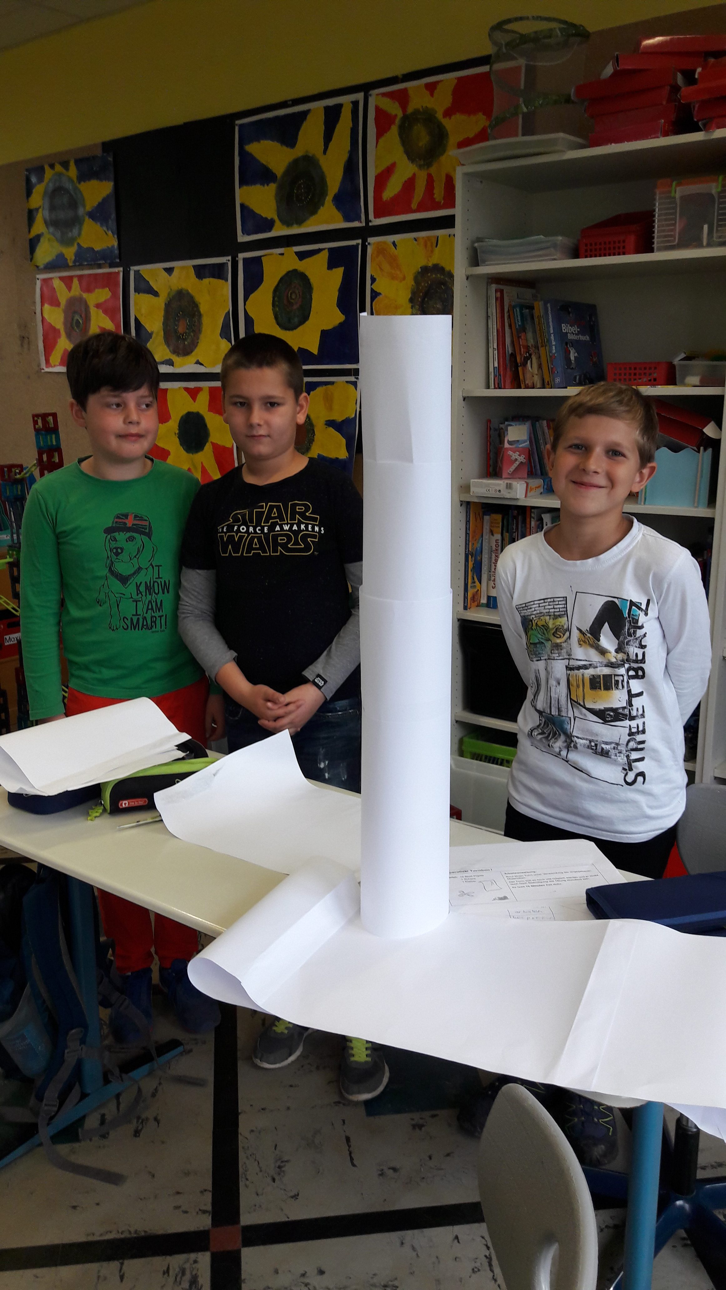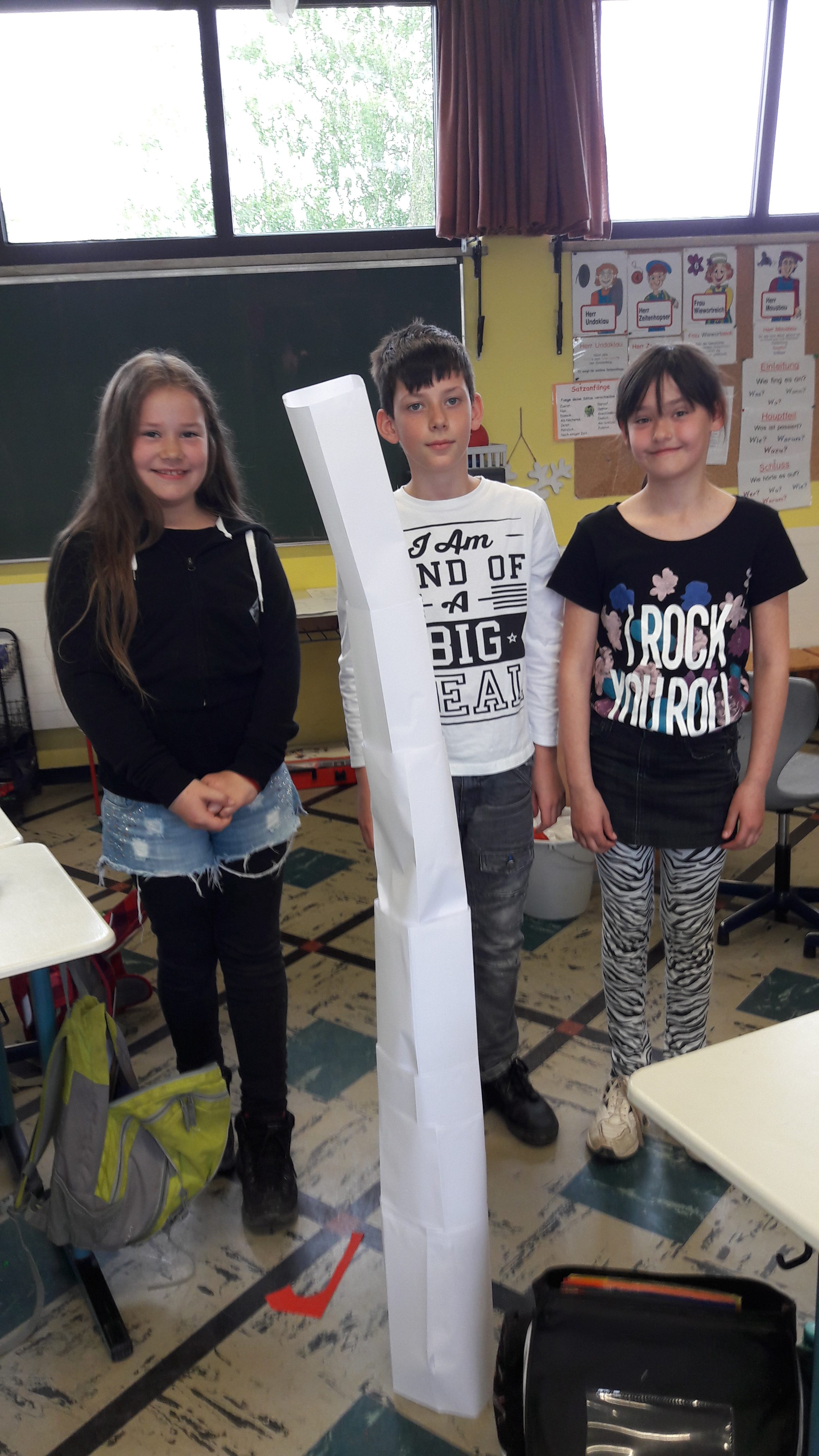 Nachdem die Kinder gemeinsam darüber nachgedacht hatten, wie sie sich ein gutes Team vorstellen, sollten sie in Zufallsgruppen einen Turm bauen. Zur Verfügung standen ihnen lediglich 10 Blatt Papier, eine Schere und ein Kleber. Die Ergebnisse wurden vorgestellt und reflektiert. Nun sollte in neuen Gruppen eine Brücke gebaut werden. Zum Schluss entwickelten die Gruppen einen gemeinsamen Vertrag für “eine gute Gruppenarbeit”!