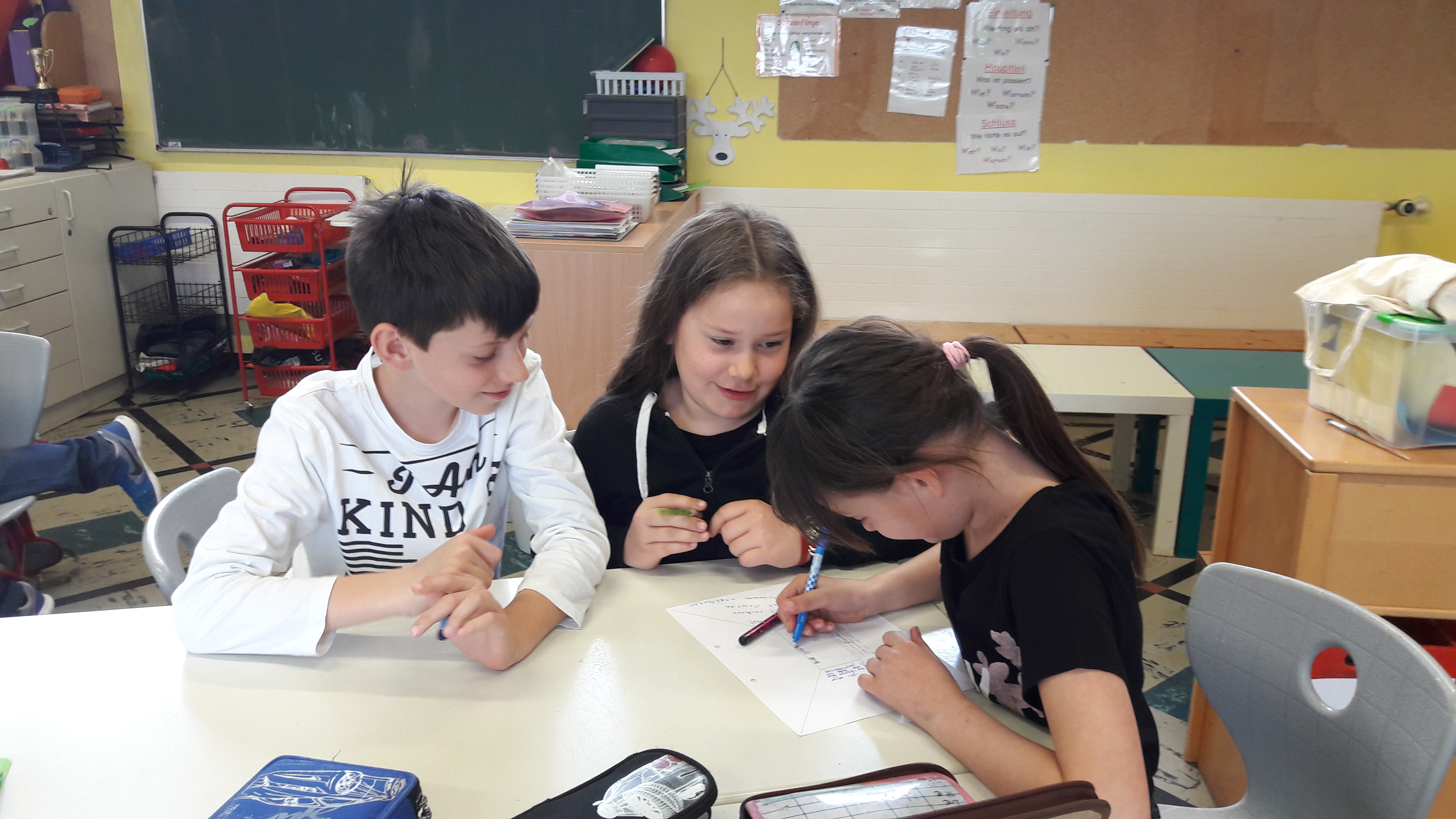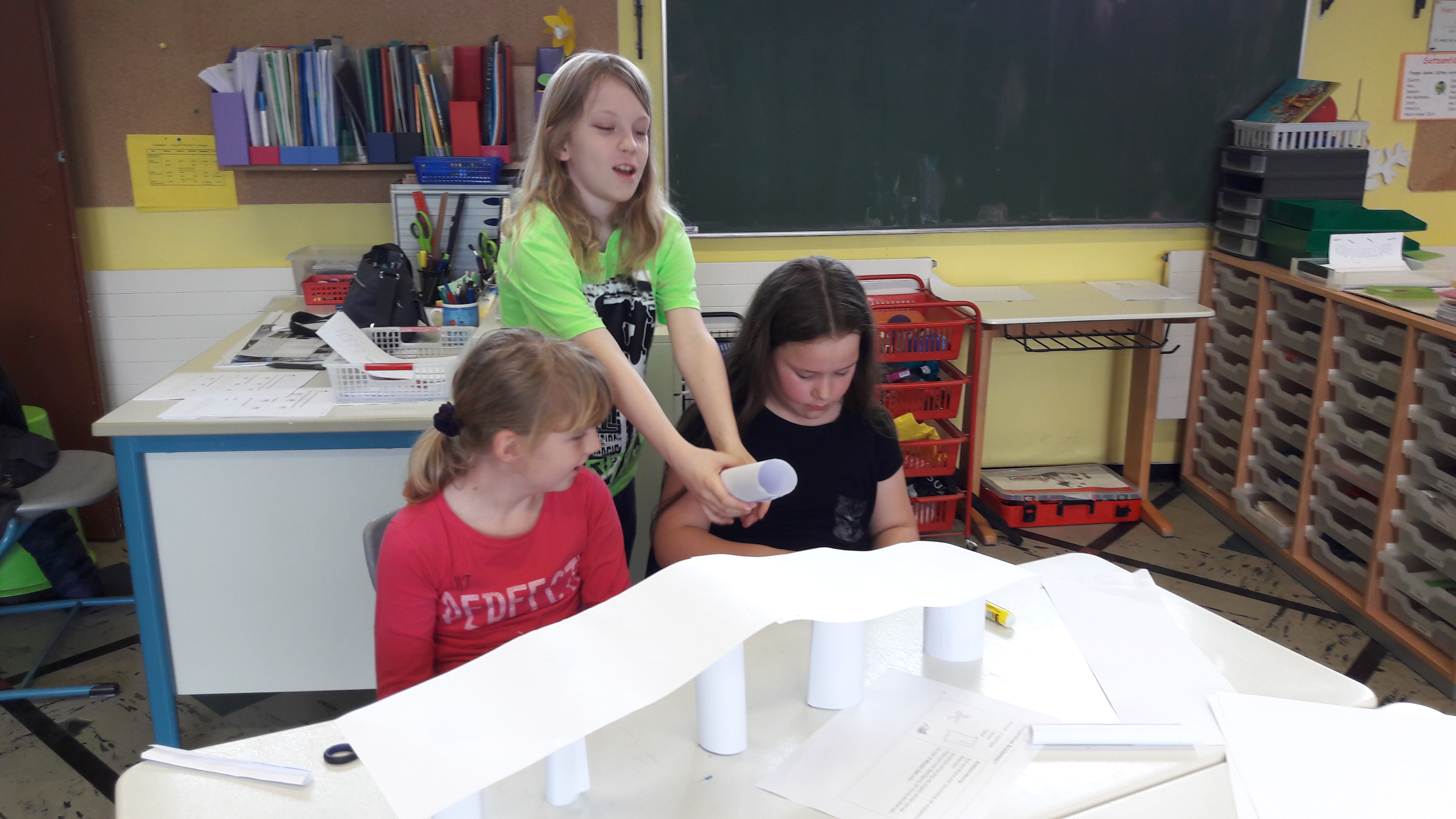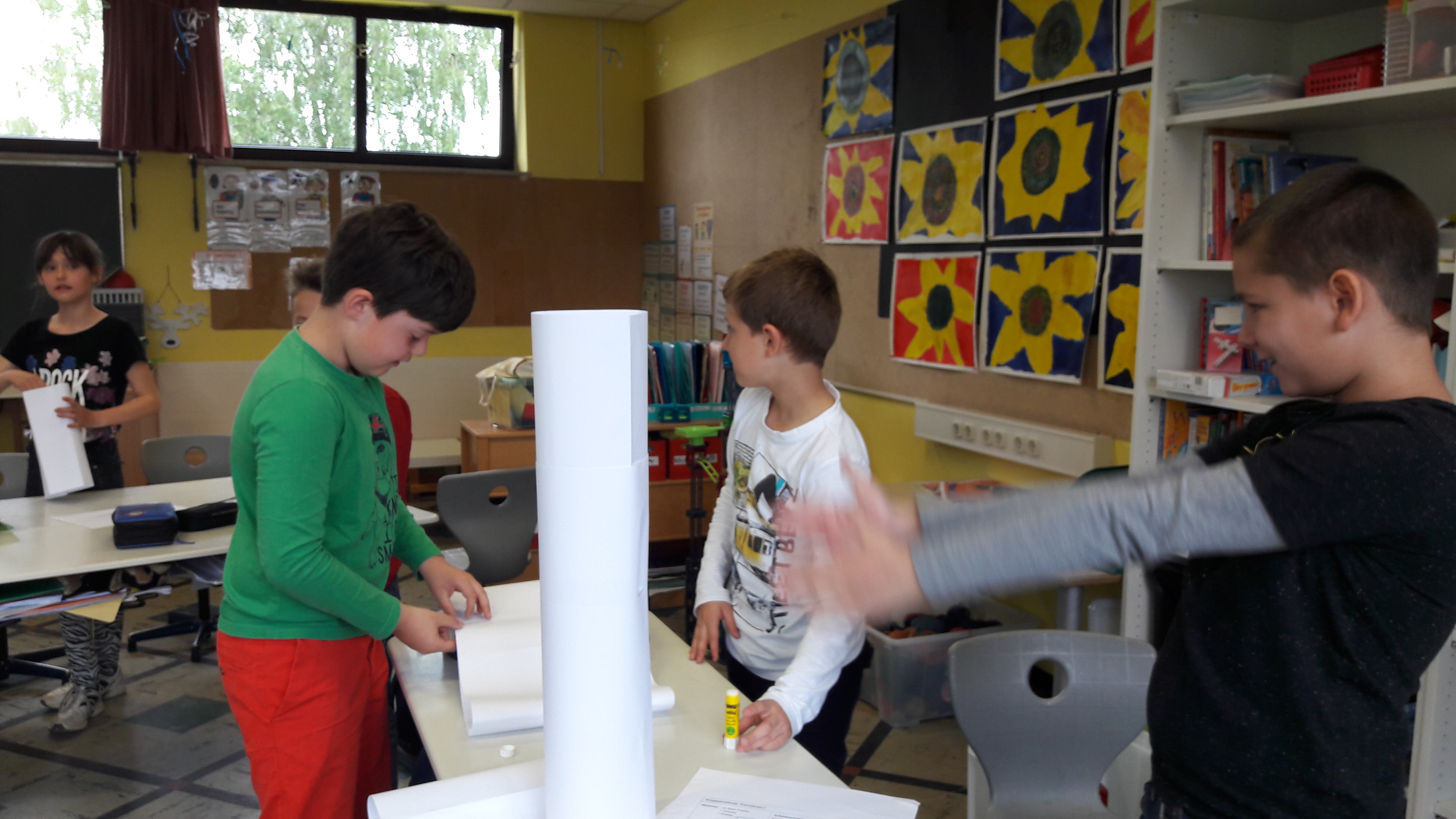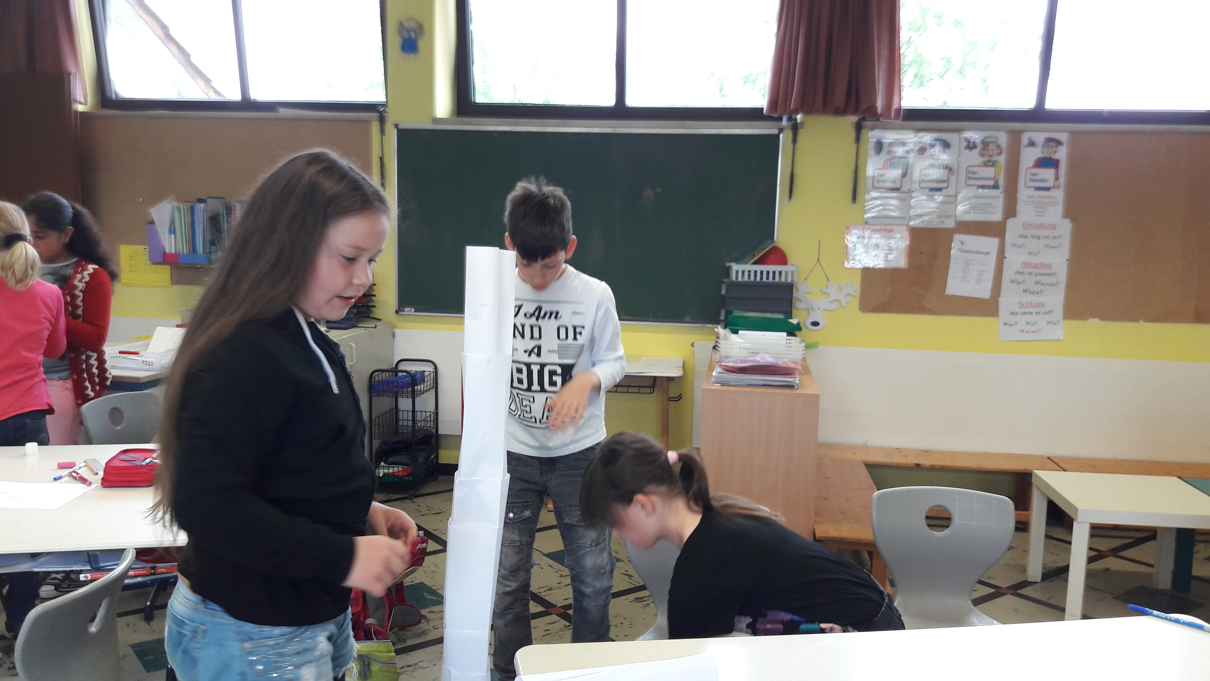 Am Methodentag handelt es sich diesmal um Gruppenarbeit. Als erstes bekamen wir ein Blatt. Darauf sollte jedes Kind schreiben, was eine gute Gruppenarbeit ist. Danach bekam jede Gruppe 10 Blätter, eine Schere und einen Kleber. Wir sollten einen Turm aus den Materialien bauen. Der Turm sollte so groß wie möglich sein. Dann haben wir gesagt, wie die Gruppenarbeit war. Als nächstes haben wir ein Blatt bekommen wir mussten ankreuzen wie die Gruppenarbeit war. Danach durften wir in die Pause. Nach der Pause mussten wir eine Brücke bauen mit 10 Blättern, einer Schere und einem Kleber. Als die Brücken fertig waren, mussten wir testen ob die Brücke stabil war. Wir bekamen danach wieder ein Blatt und mussten ankreuzen wie diesmal die Gruppenarbeit geklappt hat. Danach durften wir in die Pause.