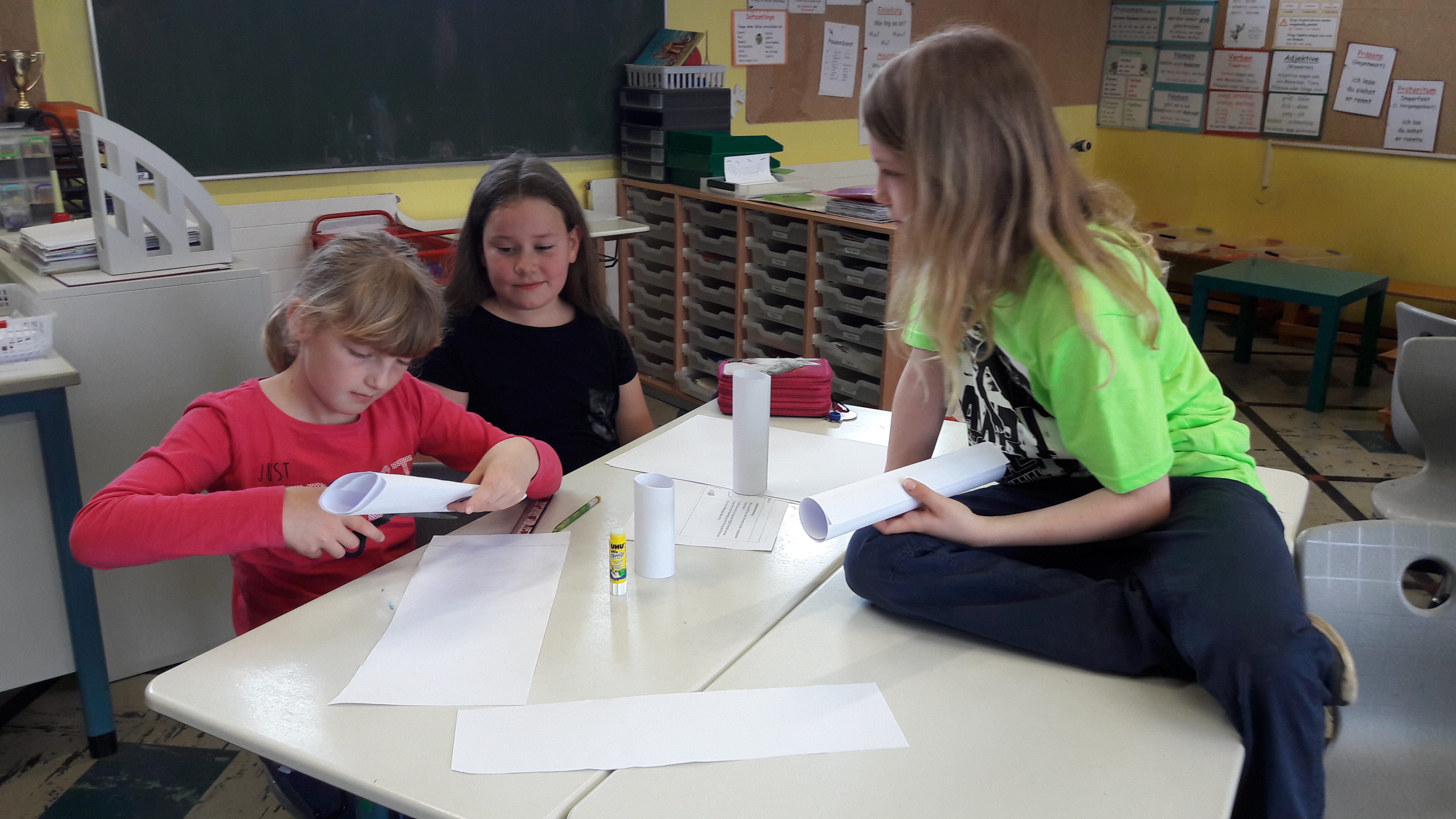 Am 12.05.2017 fand in unserer Schule der Methodentag zum Thema Gruppenarbeit statt. Wir haben gemeinsam überlegt welche Regeln es in der Gruppenarbeit gibt. Die erste Aufgabe war einen großen Turm zu bauen, der auch hält mit je: 10 Blättern, einen Kleber und einer Schere. Danach gab es ein Blatt auf dem wir ankreuzen sollten wie die Gruppenarbeit gelaufen ist. Beim manchen Kindern ist es nicht so gut gelaufen. Die zweite Aufgabe war es zu überlegen, was man in der nächsten Gruppenarbeit besser machen kann. Die dritte Aufgabe war es in anderen Teams eine lange und stabile Brücke zu bauen. Auch diesmal durfte man nur: 10 Blätter, einen Kleber und eine Schere verwenden. In einem Team wurde die Brücke so gebaut, dass 5 Autos darauf stehen konnten. In einem Team war das Problem der Gruppe, dass einer immer bestimmt hat. Auch diesmal bekamen wir einen Reflexionsbogen und jeweils in einer Frage war die Aufgabe Smileys anzukreuzen, wie es in der Gruppe gelaufen ist. Danach wurden von den Gruppen und den Brücken Fotos gemacht. Schließlich wurden die Fotos in die Website von der Schule gestellt.