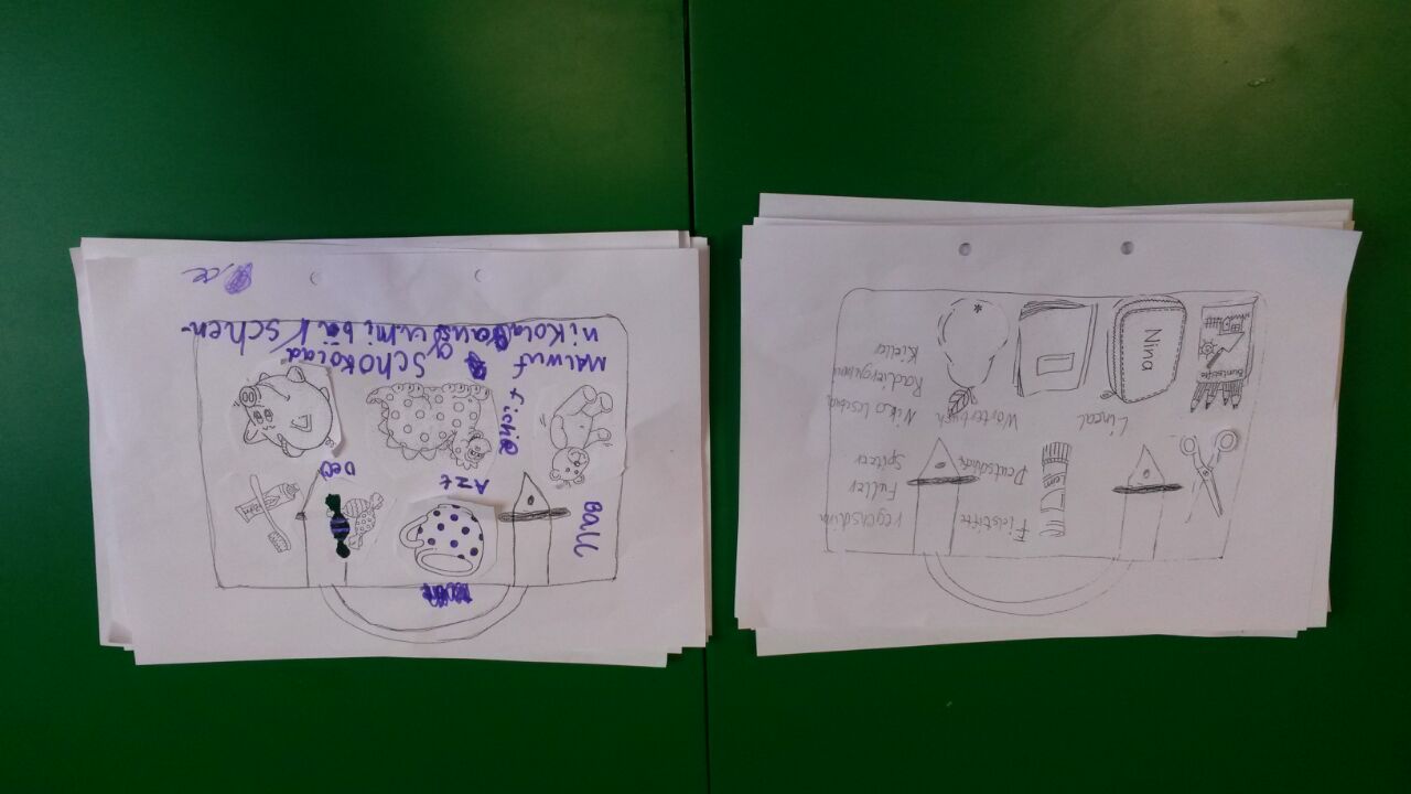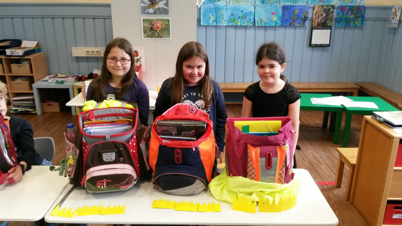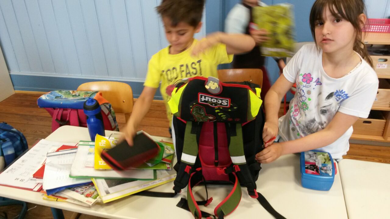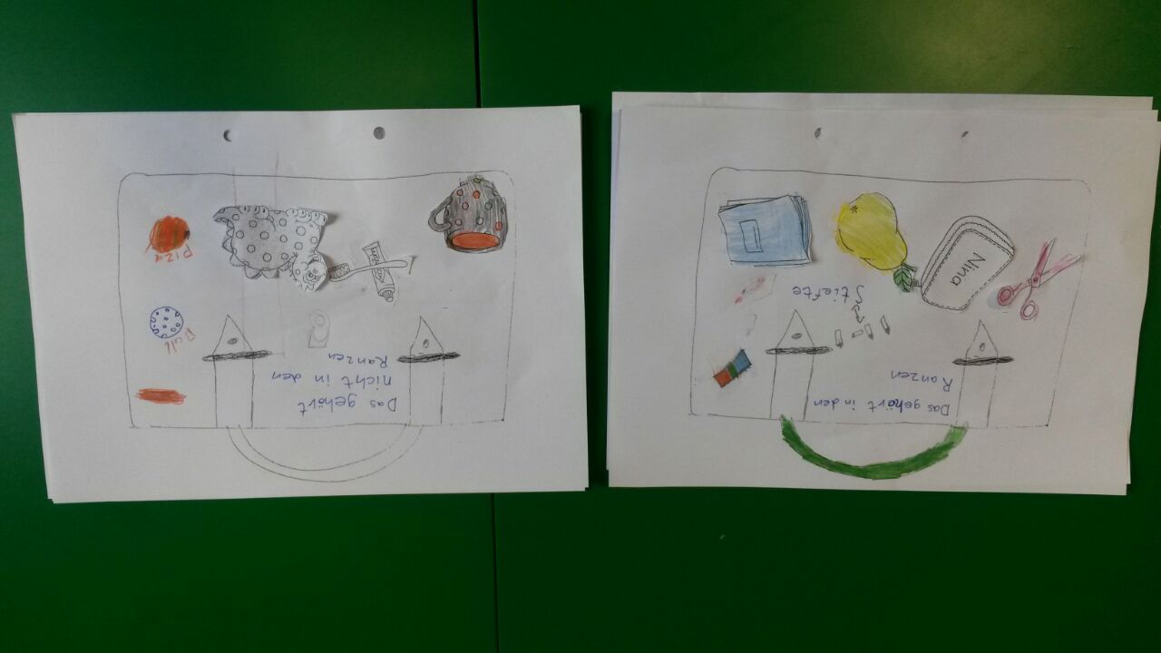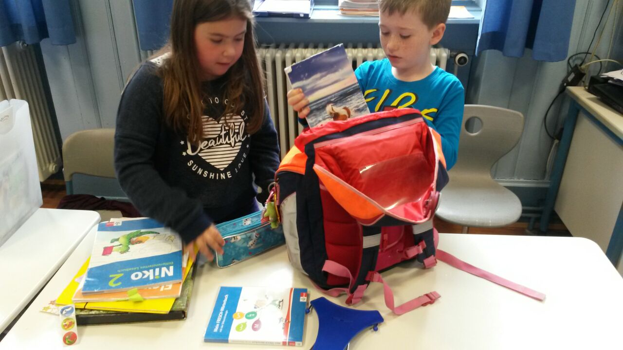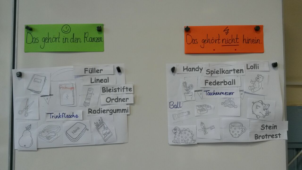Nach Begutachtung der aktuellen Ordnung im Ranzen sortierten die Kinder Gegenstände danach, ob sie in den Ranzen gehören oder nicht. Anschließend wurde ein Regelplakat erstellt und mit einem Partner der eigene Ranzen gesichtet und geordnet.
